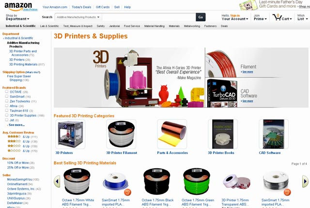 Here's some very interesting piece of news, Amazon starts offering 3D printers from some manufacturers and their related supplies. Going all the way to even setting up a dedicated product page for 3D printers and their related raw materials.